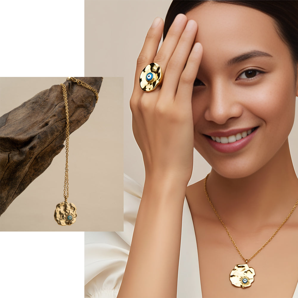 This dainty textured pendant features a subtle gold-plated finish with a tiny evil-eye charm at its heart — symbolizing positivity and good vibes.Choose the Epic ones fro Eternaa Epics