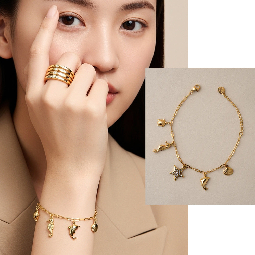 ocean-inspired charm bracelet featuring adorable sea motifs — a tortoise, shell, seahorse, starfish, and fish — all symbolizing peace, strength, and freedom. Choose the Epic ones fro Eternaa Epics