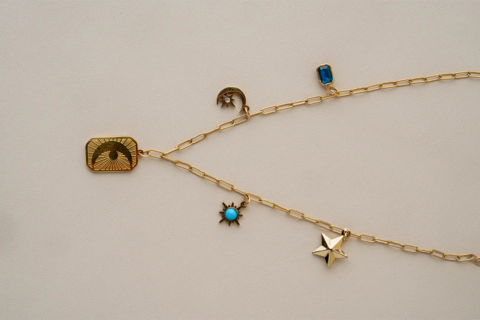 A celestial beauty that captures the night sky. Featuring a delicate moon and star design with a radiant blue stone charm, this necklace adds a soft glow to every look. Crafted with anti-tarnish, waterproof materials — made to shine, season after season.