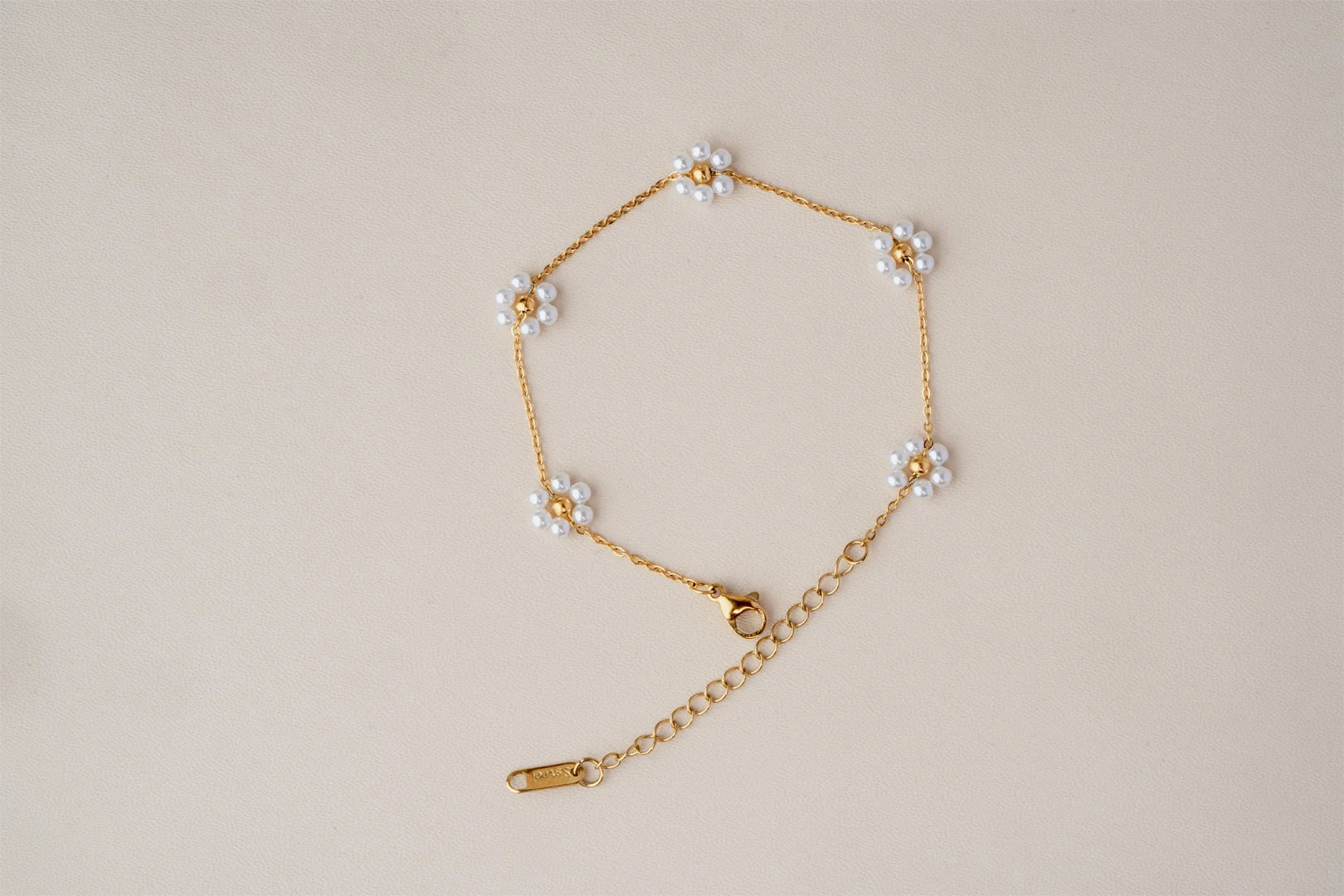 A delicate blend of timeless pearls and dainty daisies, this bracelet captures pure elegance with a playful charm. The white beads and floral accents add a soft, dreamy touch that complements any outfit — from casual chic to evening grace.